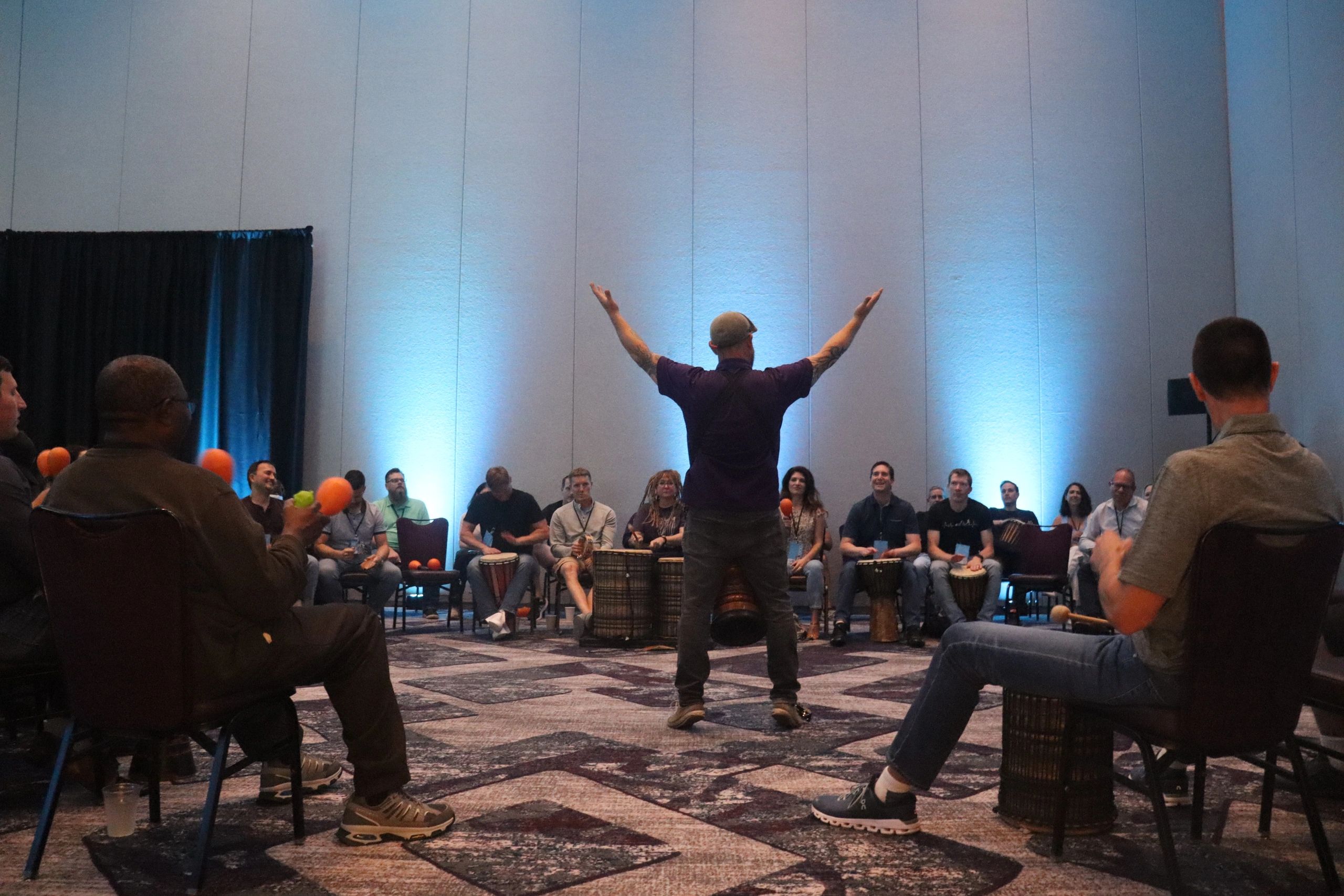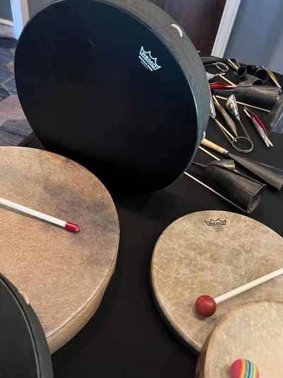 Depending upon the size of the group - a conference room, or meeting room is ideal. Outside - at a park under a covered shelter, or somewhere out of the direct sun is best - this is a physical activity and it gets hot in the sun! You will need to provide chairs for each participant, a protected space where “beautiful noise“ is acceptable, access to power for our PA system (we provide our own) - and of course smiling team members to make music with!